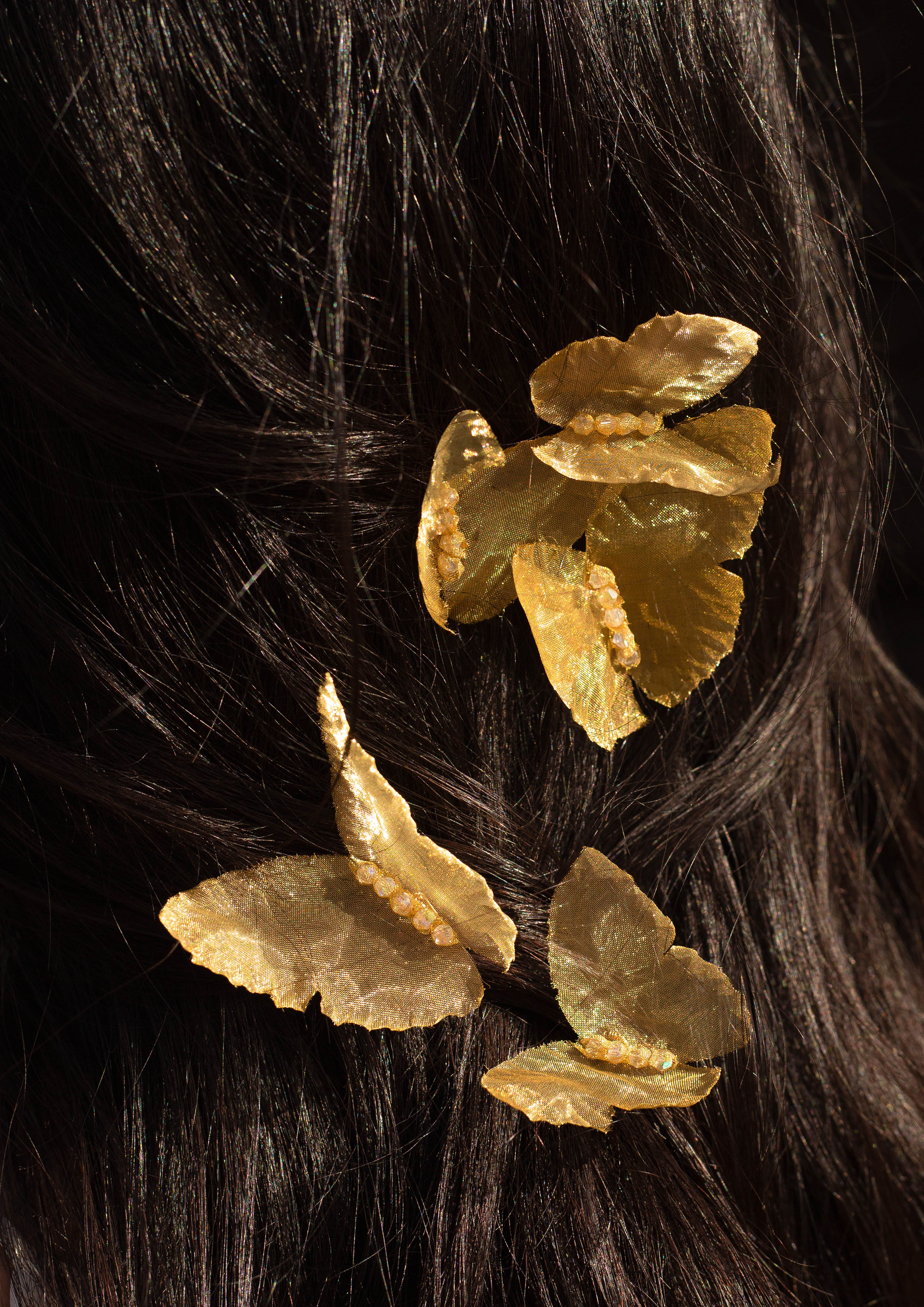 Every piece is made with signature woven metal silk sheets, hand forged into timeless, romantic headpieces, delicate hair pins and bows.