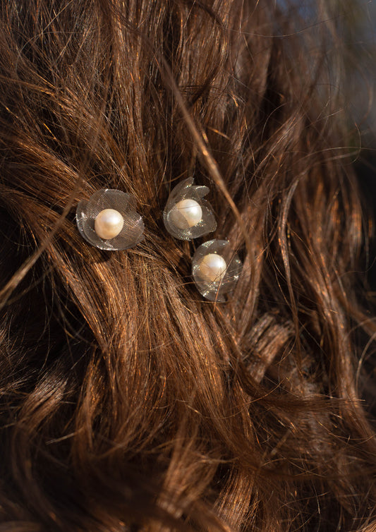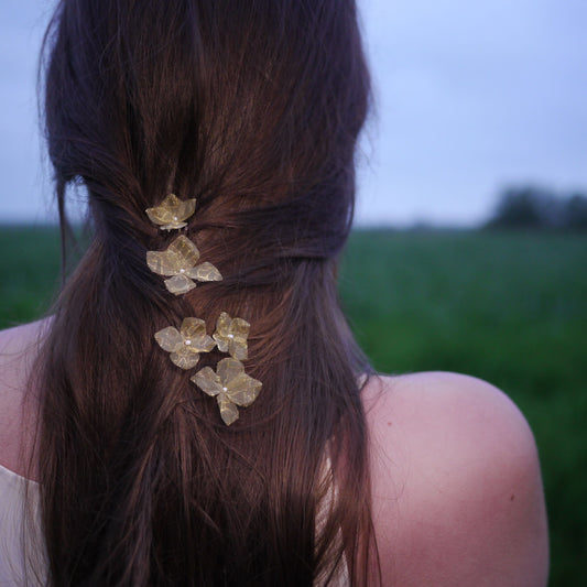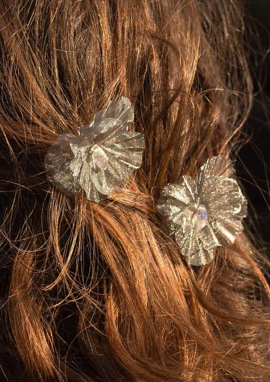 Every piece is made with signature woven metal silk sheets, hand forged into timeless, romantic headpieces, delicate hair pins and bows.