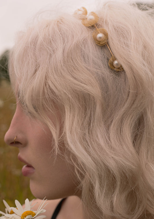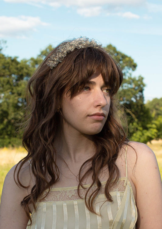 Every piece is made with signature woven metal silk sheets, hand forged into timeless, romantic headpieces, delicate hair pins and bows.