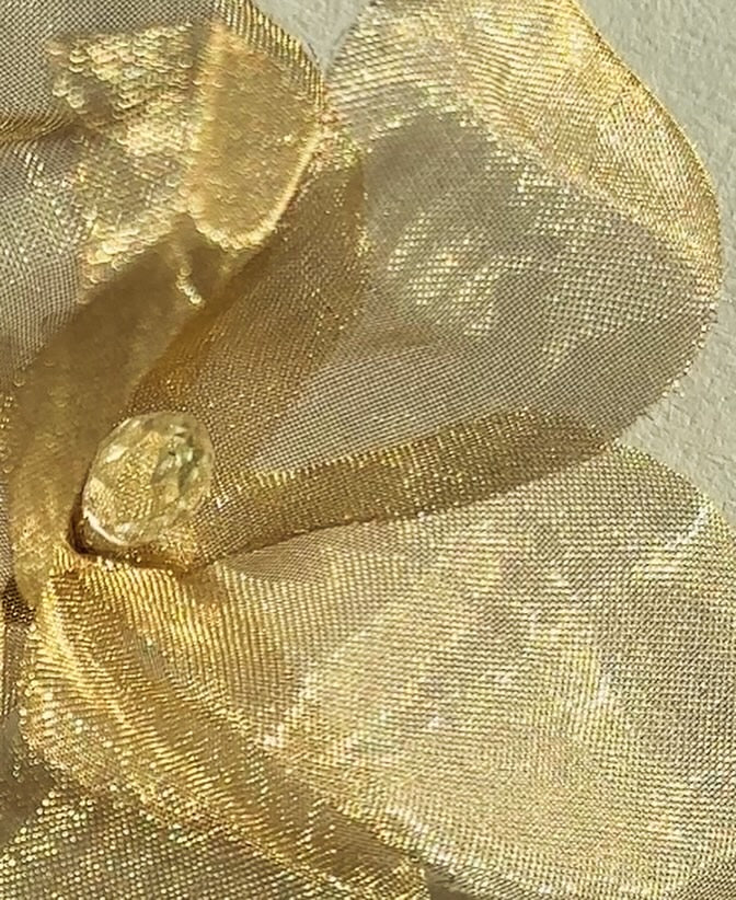 Otherwordly and ethereal in essence. This diaphanous material is architectural in a beautiful new context. In the real world, glittering woven brass is used in industry and labs for it's functional properties. Woven metallic sheeting made exclusively in the North of England, Rachel sought to create art.
