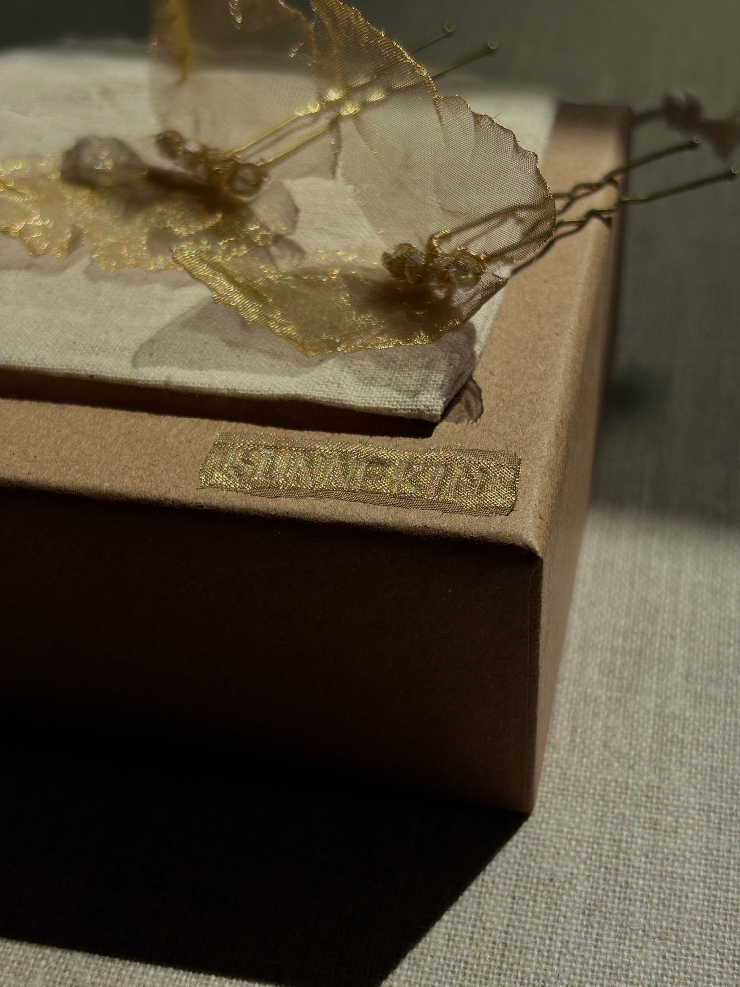 My practice has evolved so much since it's infancy, driven by a curious spirit and a thirst to always learn and develop. I’ve studied millinery and metalsmithing and now combine those with embroidery skills adapted as wirework. I use both vintage and modern tools to craft a wide range of delicate floral designs using sheets of woven brass ‘silk’ and pearls.